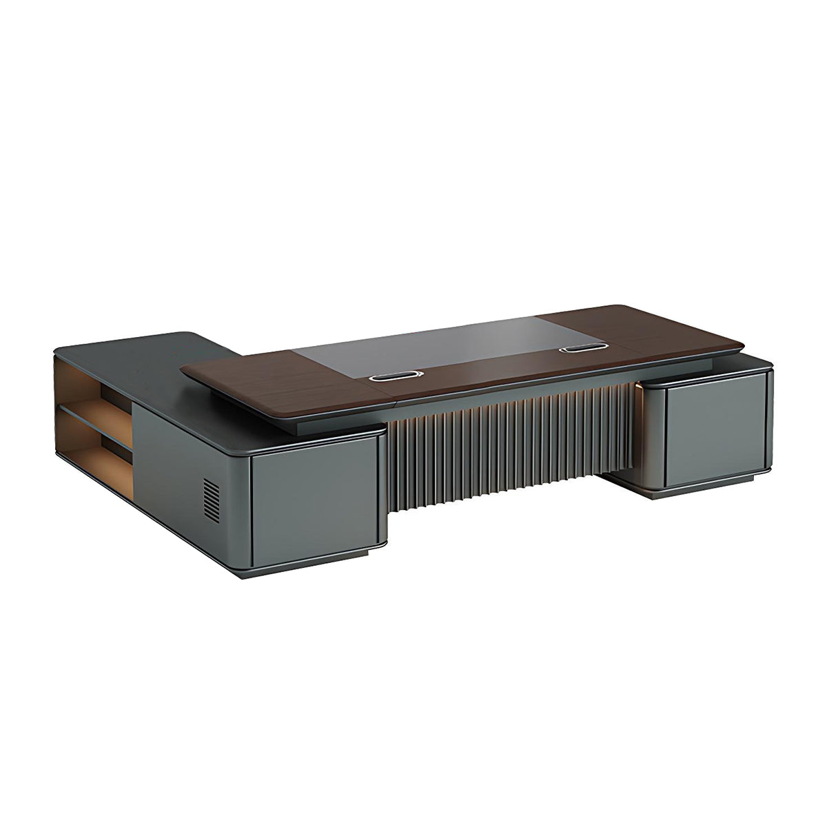 Crafted from high-quality, eco-friendly lacquered board, this executive desk combines elegance and functionality. It features a wide woodgrain desktop with rounded corners, built-in LED lighting, aluminum cable management, a fingerprint lock for security, and spacious dual cabinets for organized storage. Perfect for high-end offices and executive suites