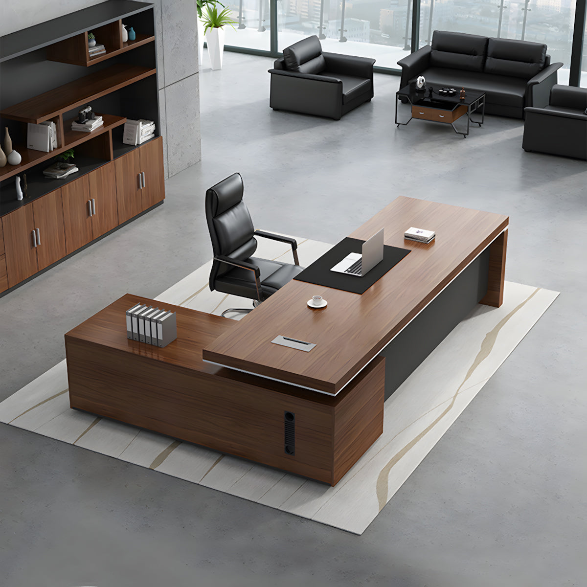 This modern executive desk blends style and functionality for any professional workspace. It features a PU leather pad, ergonomic privacy panel, E1 eco-friendly board, thickened desktop, reinforced legs, spacious side cabinets with optional left or right placement, sliding doors, ventilation, ample legroom, and cable management. Available in multiple sizes, perfect for offices or executive suites.