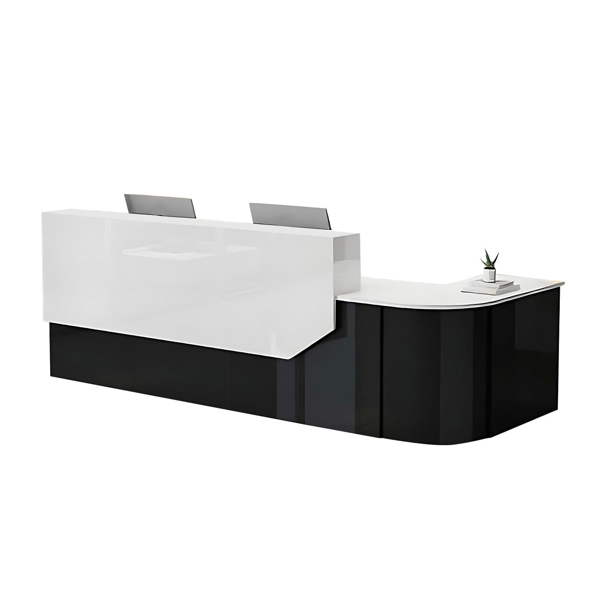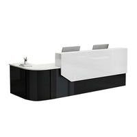 Modern curved reception desk crafted from eco-friendly melamine boards with refined edge banding for lasting durability. Smooth-sliding drawers and generous storage compartments keep essentials organized, while rounded corners enhance safety. Perfect for offices, retail shops, and small commercial spaces