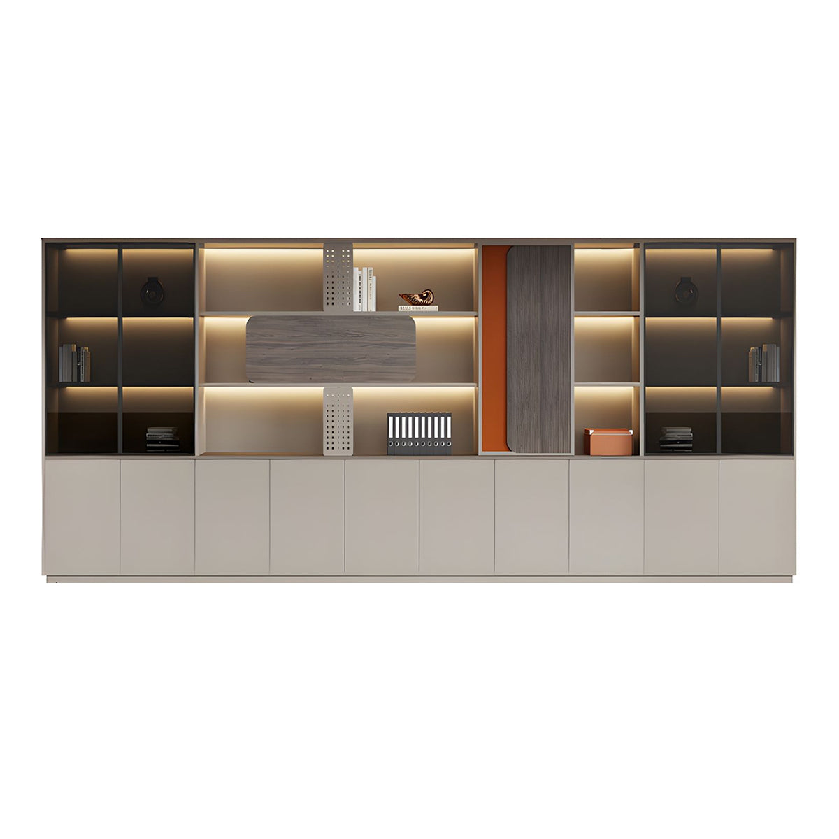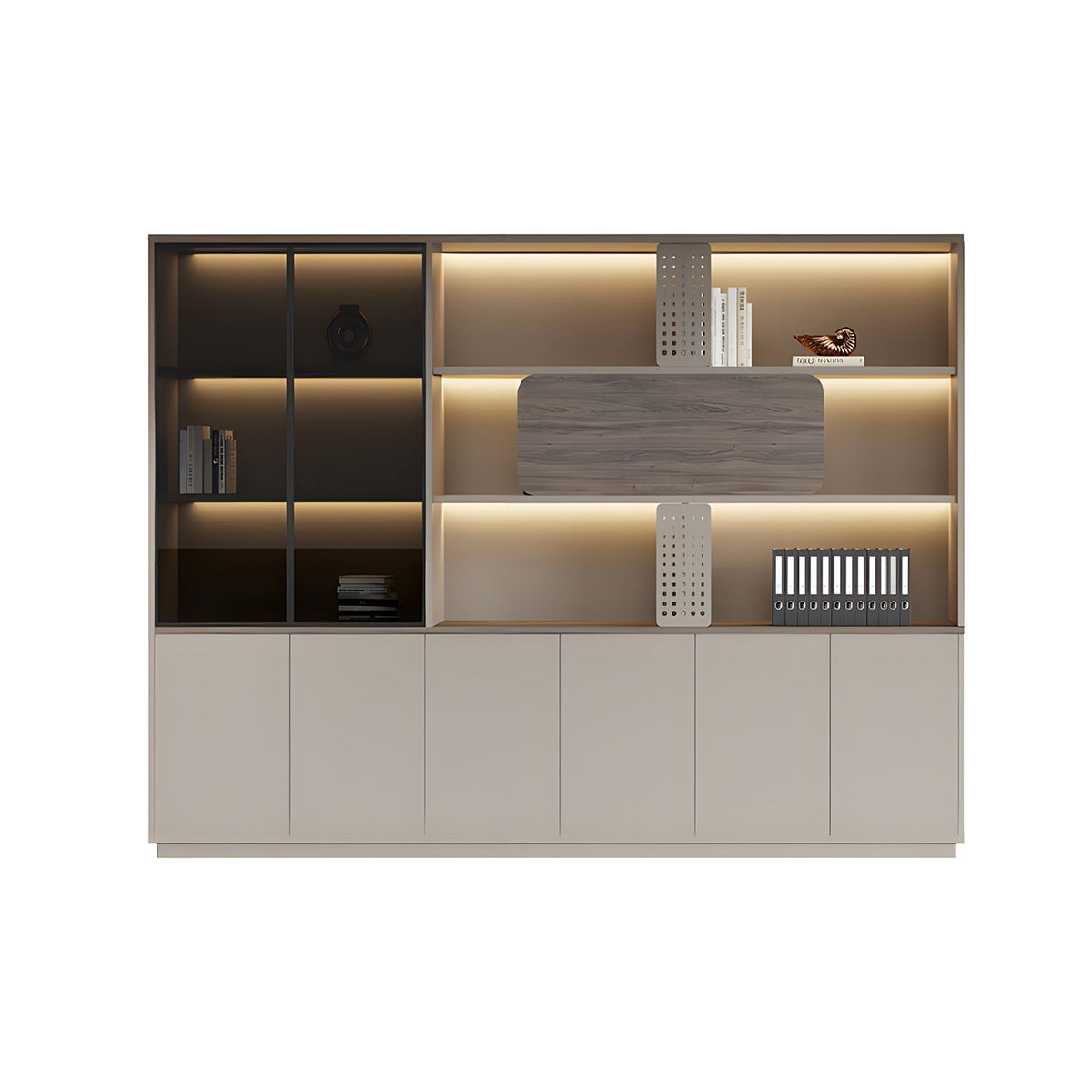 The aluminum-framed glass doors provide visible storage, keeping items dust-free while enhancing the sense of space. This design makes the office feel brighter, more open, and visually appealing.