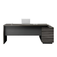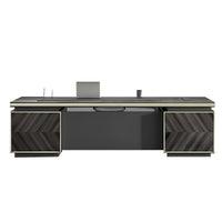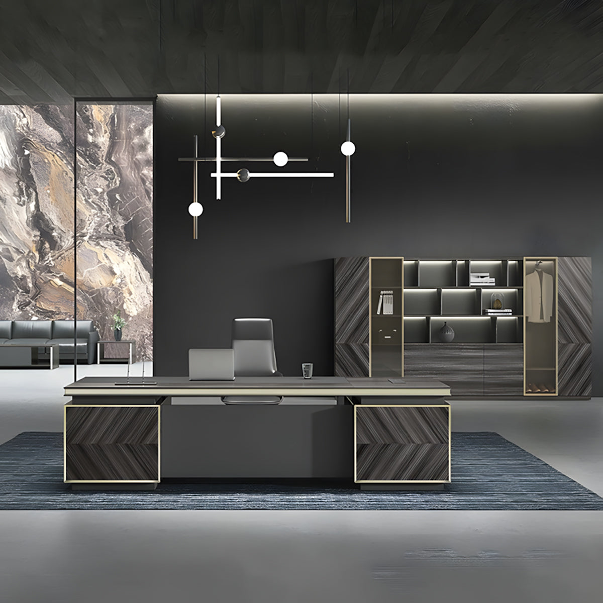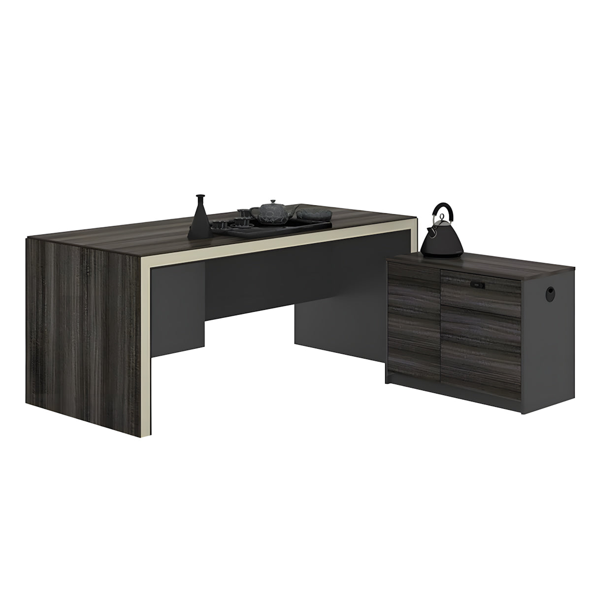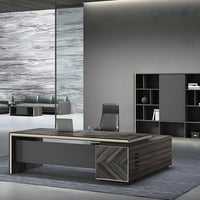 This modern executive desk combines style and functionality for offices, manager rooms, or home workspace. Made from E1-grade MFC panels with precision edge banding, it features a spacious desktop, sturdy legs with a gray leather-textured modesty panel, cable management grommets, and multi-layer storage cabinets with lockable drawers. Available in multiple colors and sizes to suit your office setup.