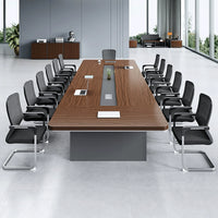 This modern rectangular conference table is perfect for offices, meeting rooms, training areas, and reception spaces. Made with eco-friendly E1-grade board, it features a wide tabletop with a central groove and built-in cable box for a clean look. Rounded edges and sturdy thick legs support up to 1102lb, while the natural wood grain design adds elegance. Available in multiple colors and sizes to fit different needs.