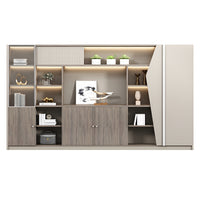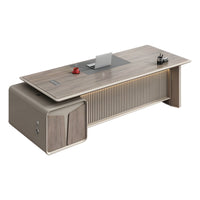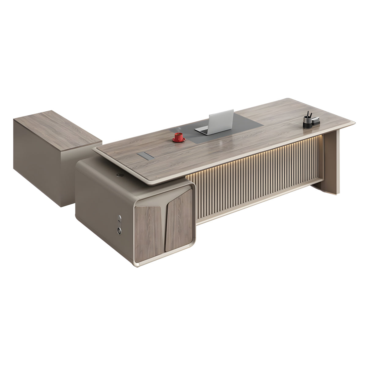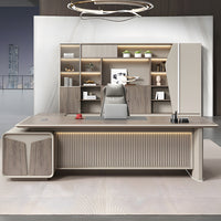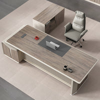 This modern luxury executive desk is perfect for offices, managerial suites, or home workspace. Made from durable melamine board, it features a thick desktop, rounded corner cabinets, and a leather-textured panel. Additional highlights include a grid-style front panel, built-in multimedia cable box, three-digit combination lock, ventilation design, and optional left or right side cabinet placement. Multiple sizes are available to suit your workspace needs.
