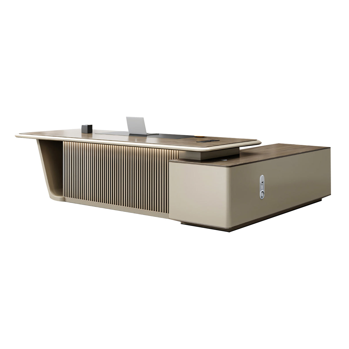 This executive office desk blends modern luxury with practical design, perfect for manager offices or stylish home workspace. It features a thickened double-layer tabletop for ample workspace, sturdy angled legs, and a side cabinet with a 3-digit combination lock for secure storage. A multimedia box and built-in ventilation holes support easy connectivity and device cooling. Available in multiple sizes, it offers both elegance and efficiency for professional environments.