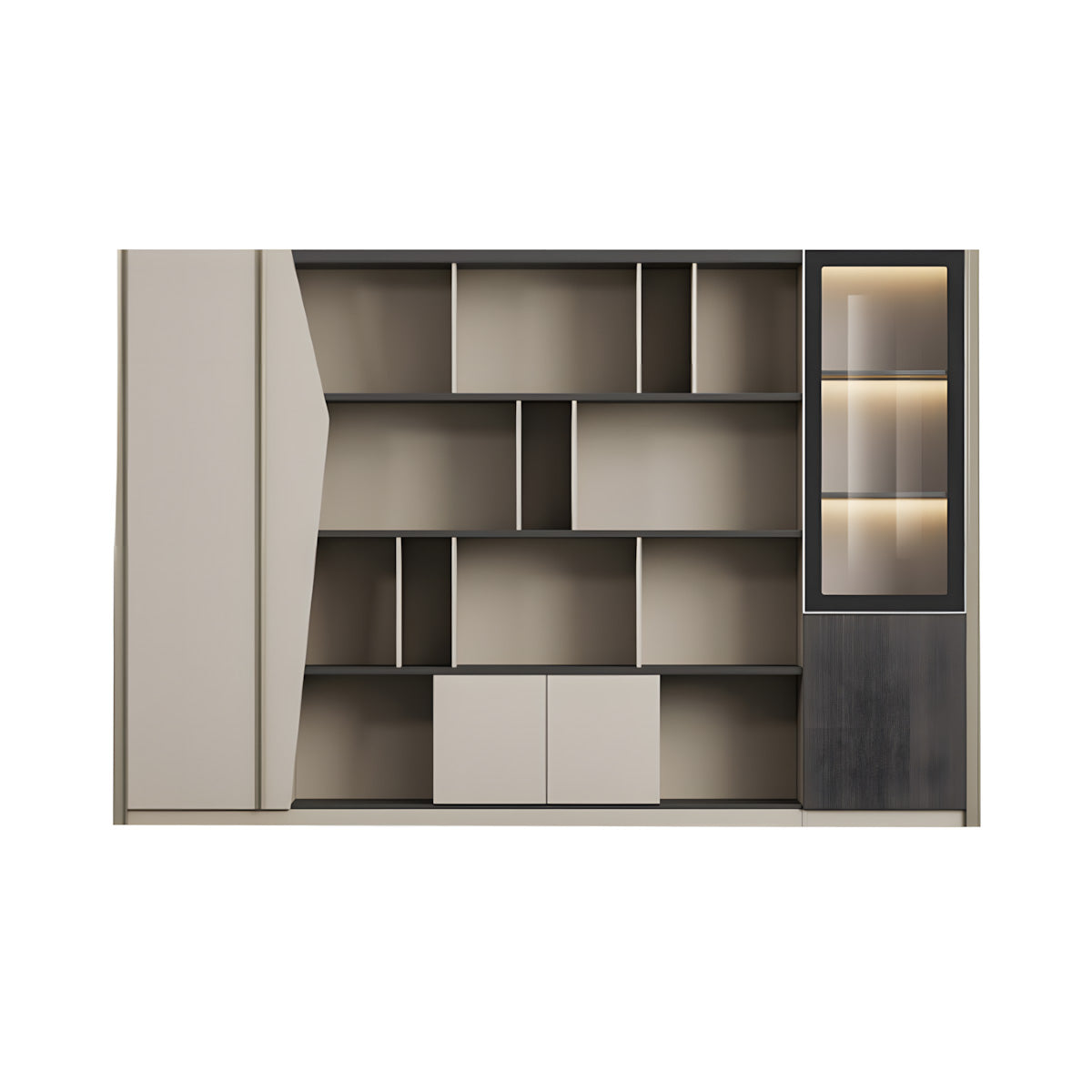 The glass cabinet doors feature built-in LED strips with independent switches, providing clear illumination and enhanced visibility. This design elevates the office ambiance, adding a modern, stylish, and inviting visual appeal.