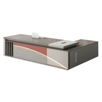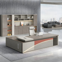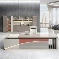Enhance your office with this modern minimalist executive desk, ideal for managers, supervisors, and home offices. It features a creative curved front panel, high-density melamine board, hidden LED light strip, large side cabinet with 3-digit combination lock, genuine leather handles, and thick hollowed desk legs for stability. The side cabinet can be placed on the left or right, and multiple sizes are available, offering a stylish and functional workspace for any professional setting.