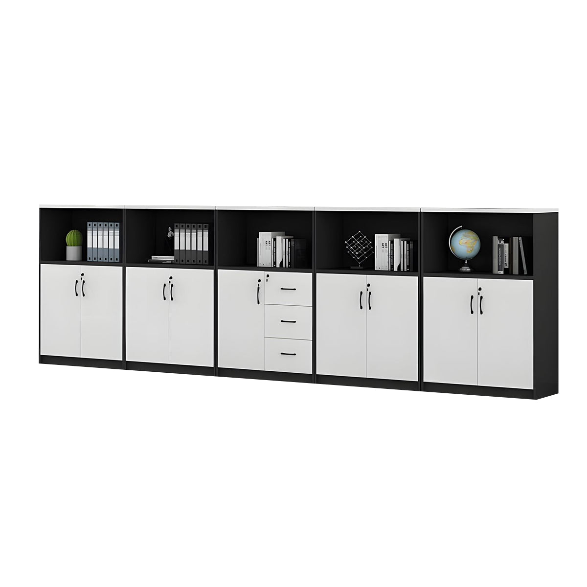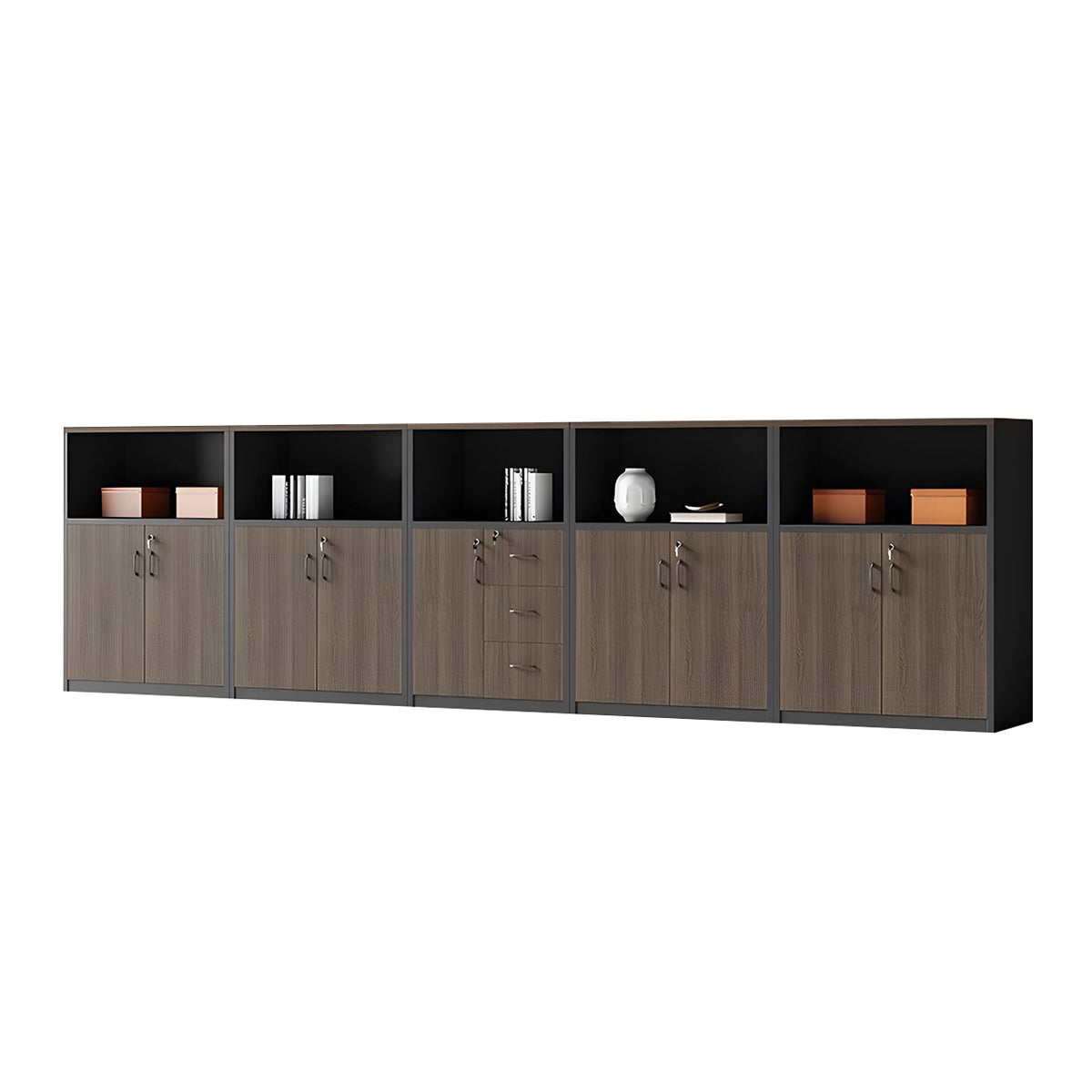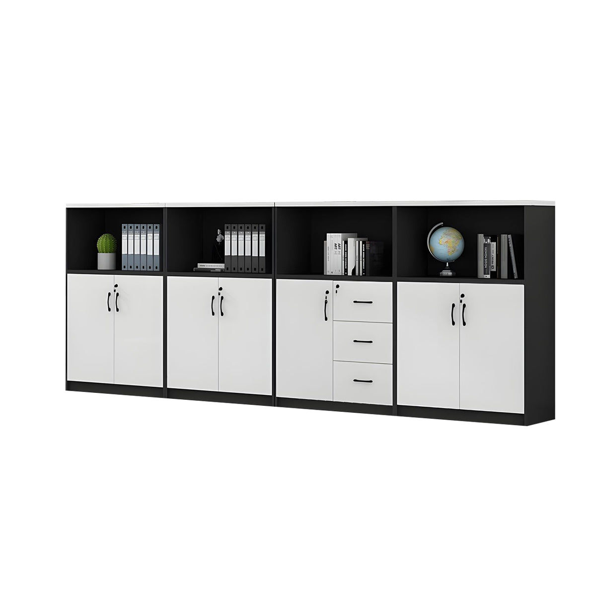 This versatile office cabinet combines solid eco-friendly wood panels with a spacious top surface for flexible storage. Open compartments and multi-section drawers provide organized, accessible storage, while a mechanical combination lock ensures security. Ideal for offices, meeting rooms, or as a partitioned storage solution.